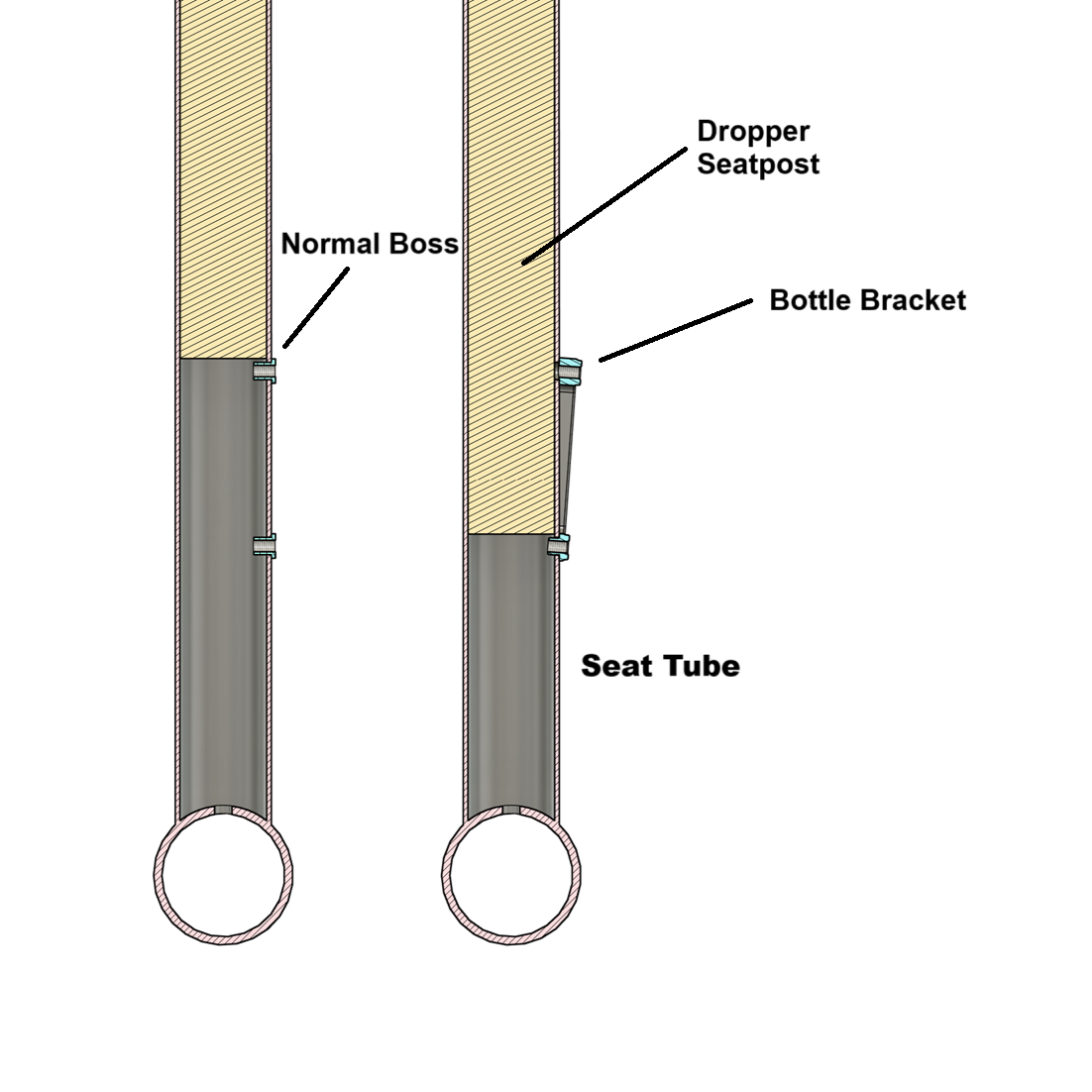 Dropper posts have revolutionized mountain biking, allowing riders to lower their saddle on descents for better control. But it requires a deep insertion into the seat tube, which interferes with the water bottle mounts. The problem is even worse on smaller frame sizes. Riders often resort to hydration backpacks, but nothing is worse than wearing a sweaty backpack while trying to climb a mountain!