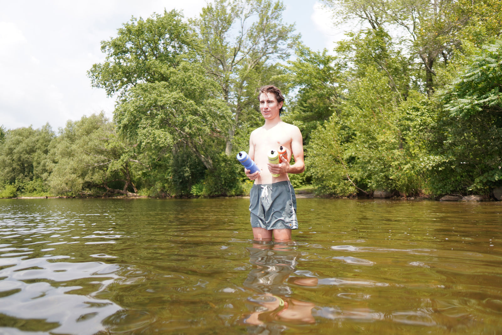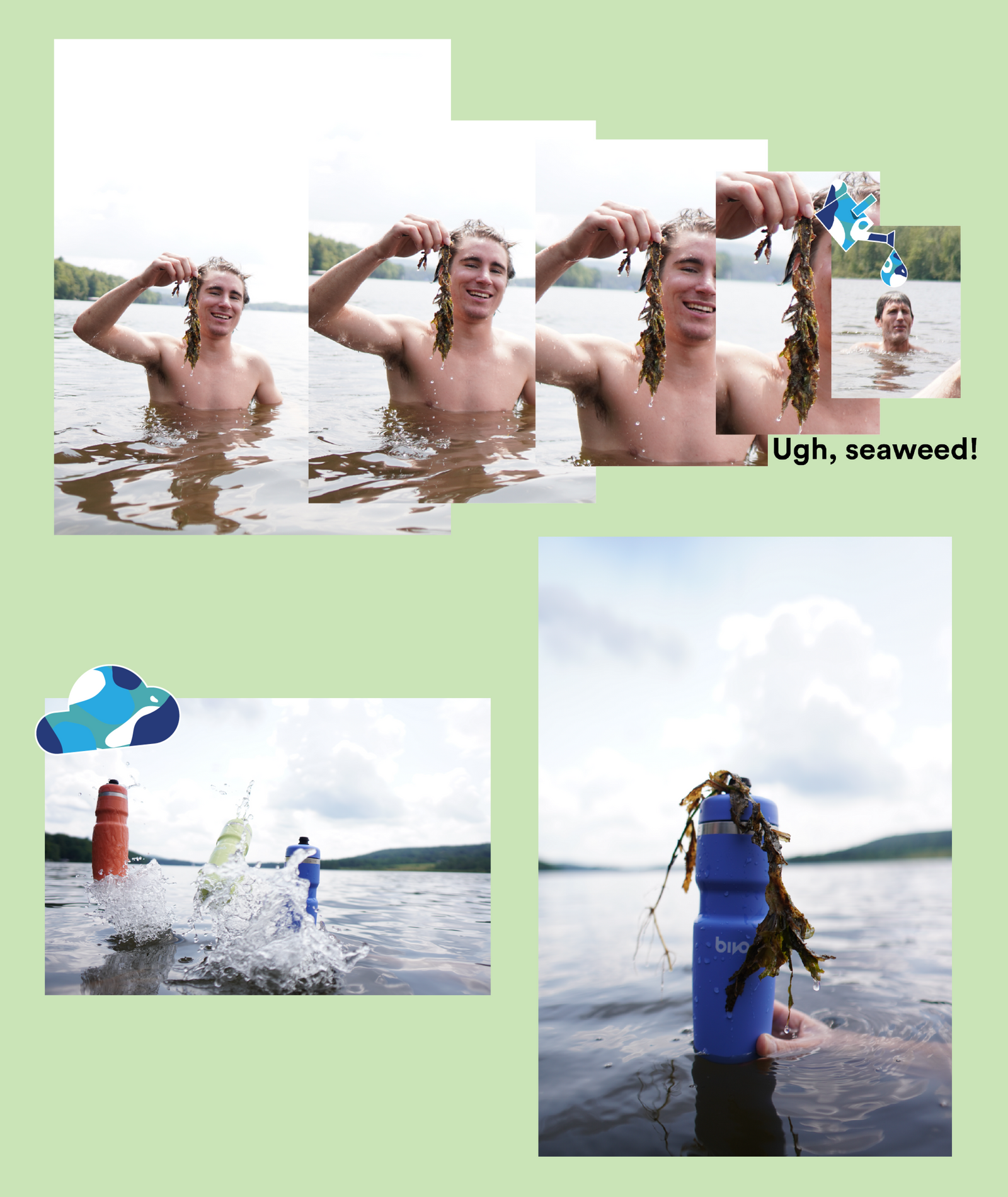 Our vision was to have the bottles sticking out of the water with only our hands visible, but it ended up being pretty tough to stay still under water and hold the bottle where you wanted it. Also, the seaweed snaking up from the ground of the lake and wrapping around our ankles wasn’t helping matters.