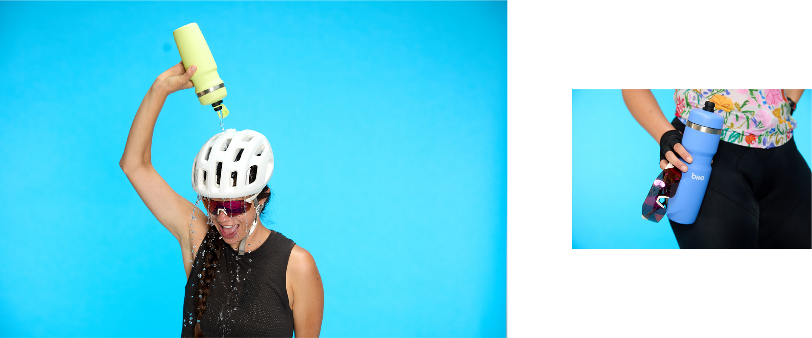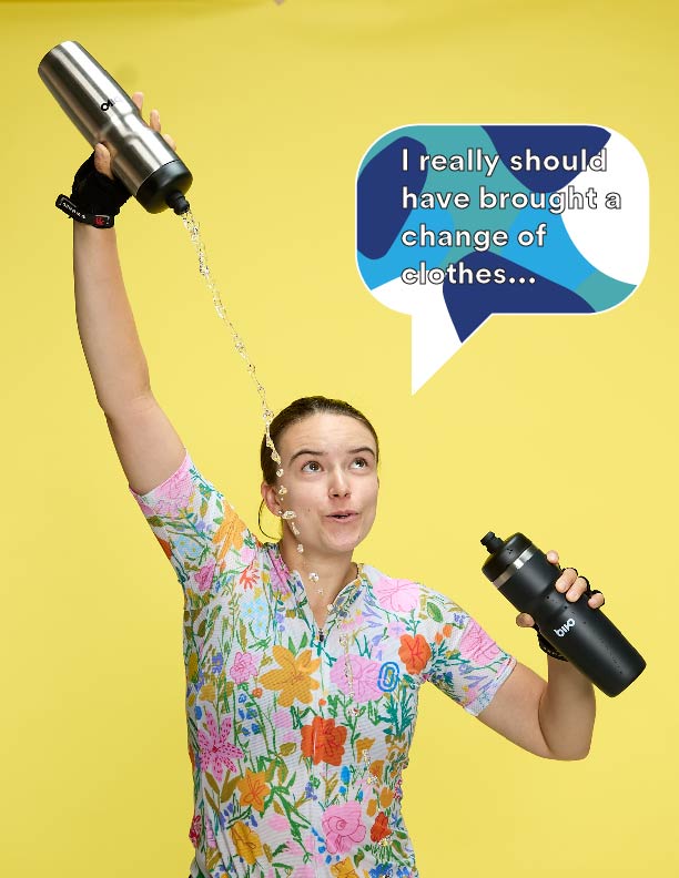 Throughout the day, Carina and I snuck in a few photos, pouring water over our heads in our cycling helmets, glasses, and gloves.