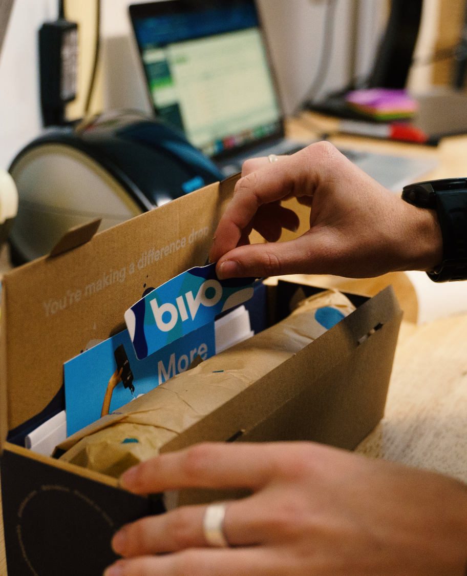 Finally, our shipping box was designed to act as our ‘brand box’ all in one. While we know that stickers and shopping always scuff up a box on your doorstep, we also know our Bivo customer is simply excited about what’s in the box. So we focused there, placing modular structures that hold your Bivo in a safe place, while still having fun with hidden messaging inside the box.