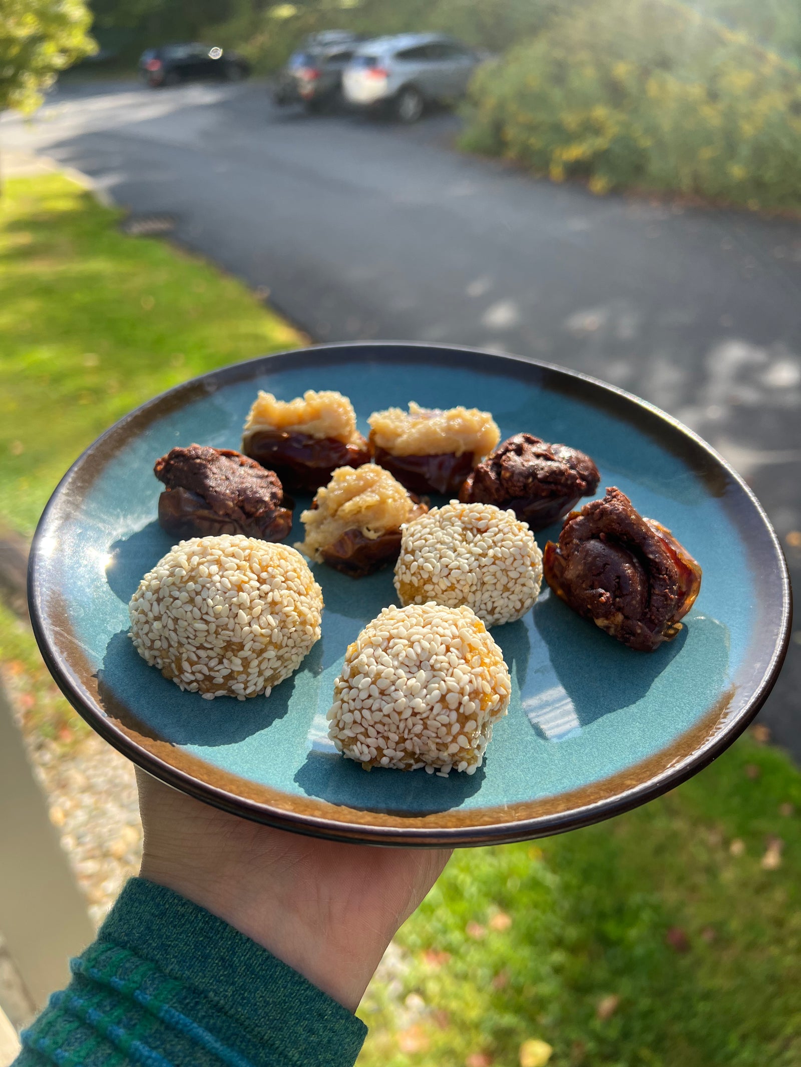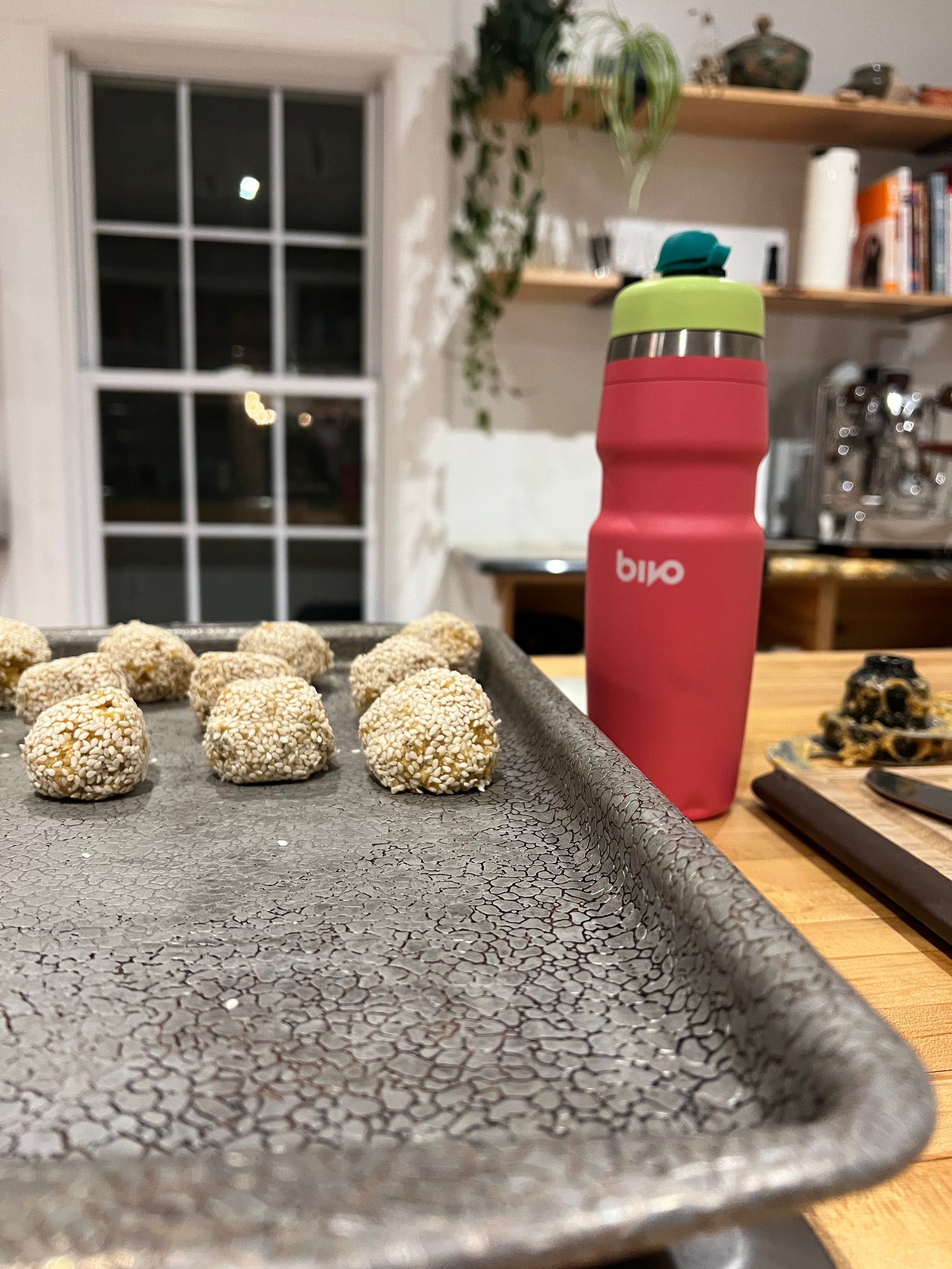 Using damp hands, roll mixture into 1-inch sized balls. You should get 12 balls. Spread sesame seeds out on small plate and roll balls in seeds. Place balls in the refrigerator to firm up.