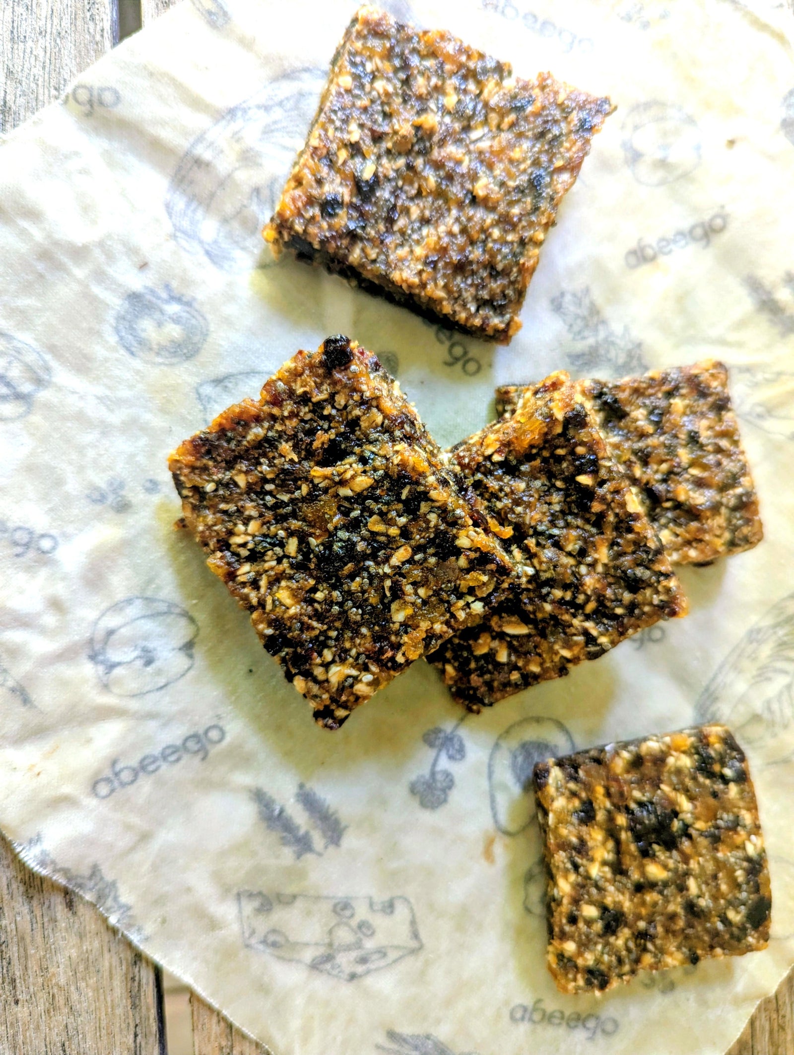 Made mostly of carb-dense dried fruit, these bars are fantastic on-the-go fuel. Very little fat and protein means they will digest well for most people. They also hold up well when stuffed in a jersey pocket for countless steamy hours. I like to bundle them up in reusable beeswax wraps.
