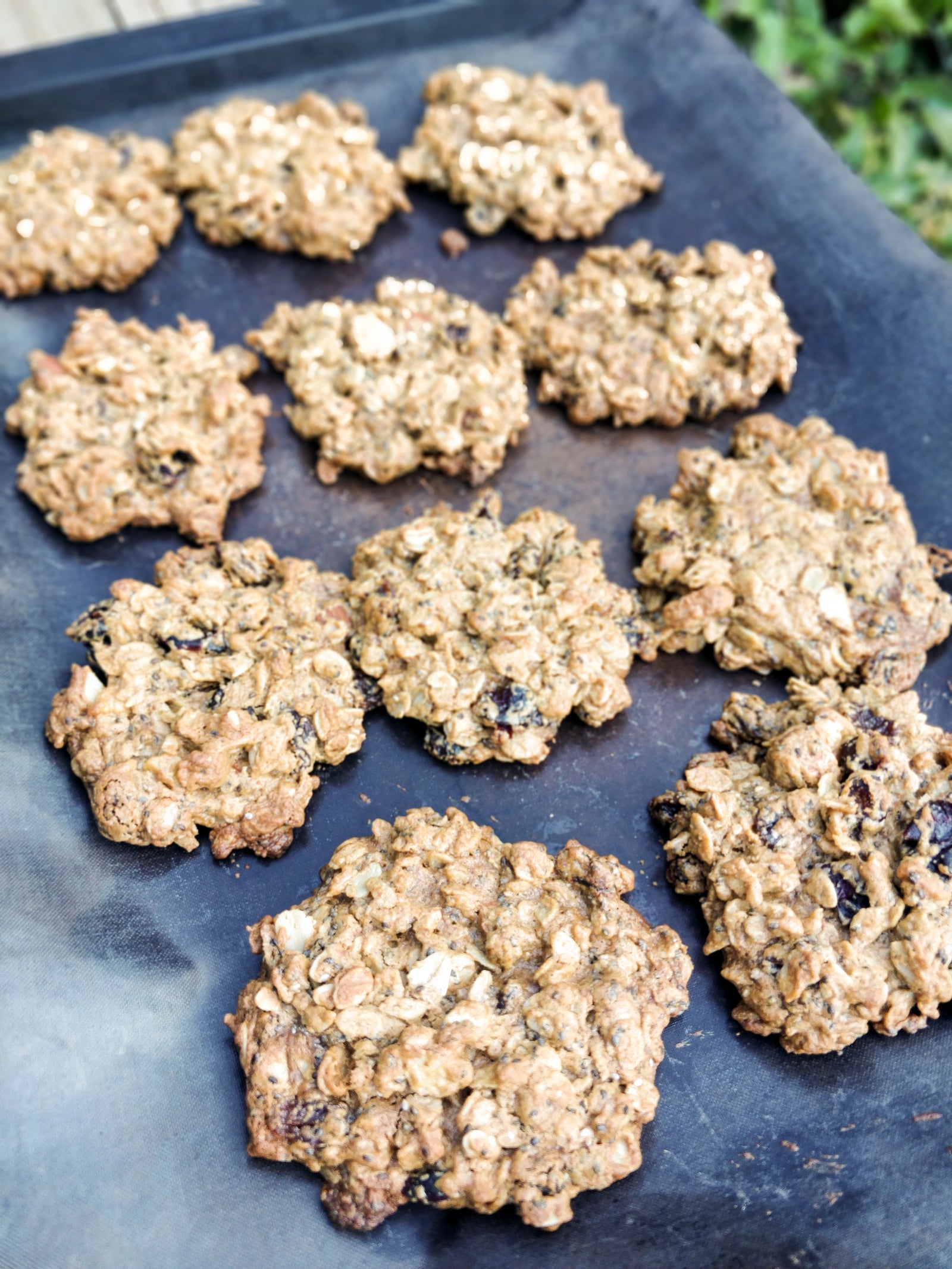 Using a 1/4 cup measuring cup, scoop out dough and place on a baking sheet. Use bottom of the measuring cup to slightly flatten cookies. Bake for 13 minutes, or until the edges begin to turn golden brown and the tops of the cookies only give slightly to the touch. Let cool slightly before cooking fully on a metal rack. They will firm up further during cooling. Transport in a zip-top bag or other container of choice.