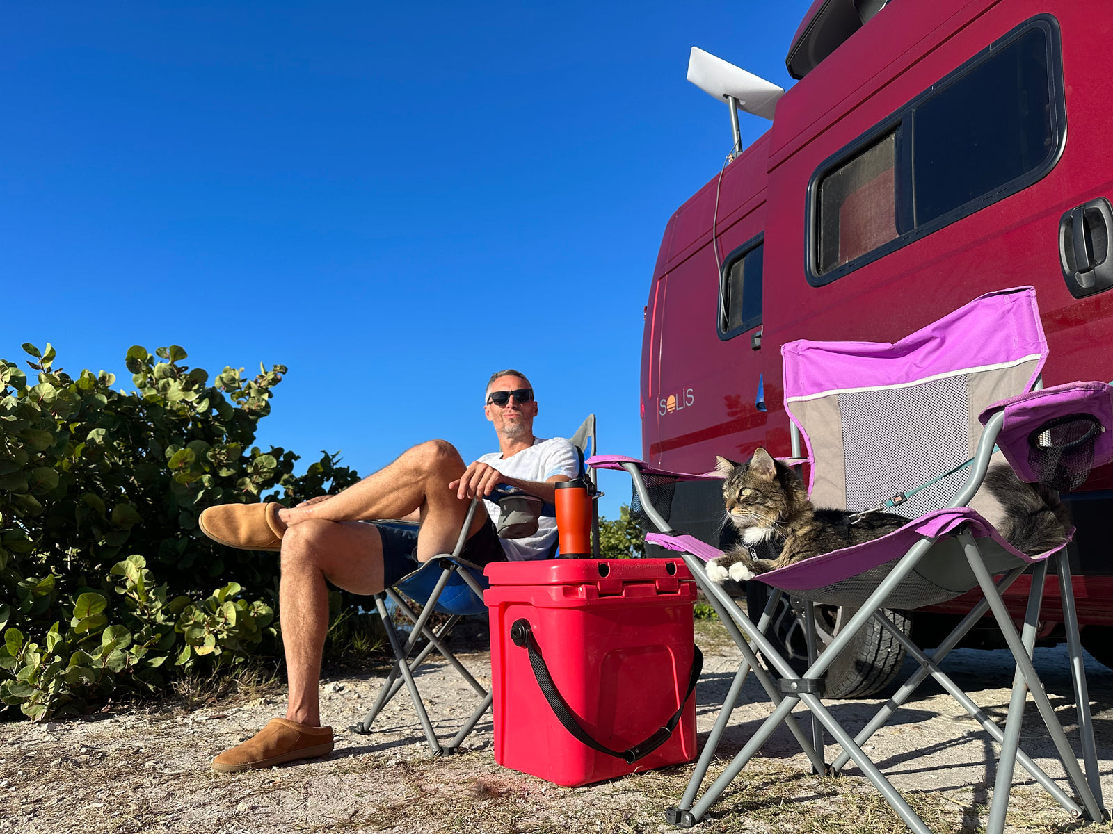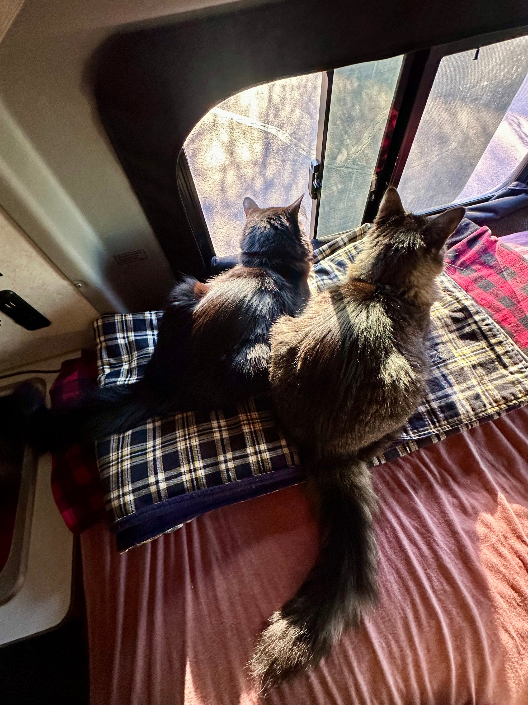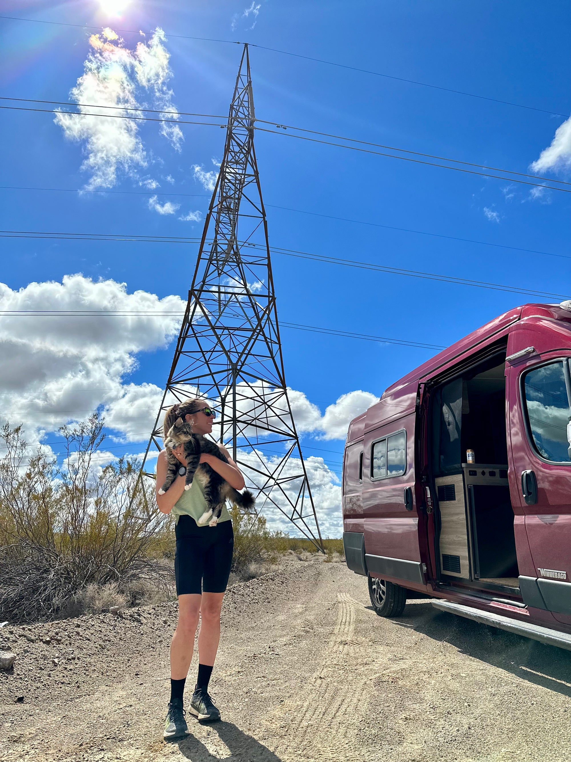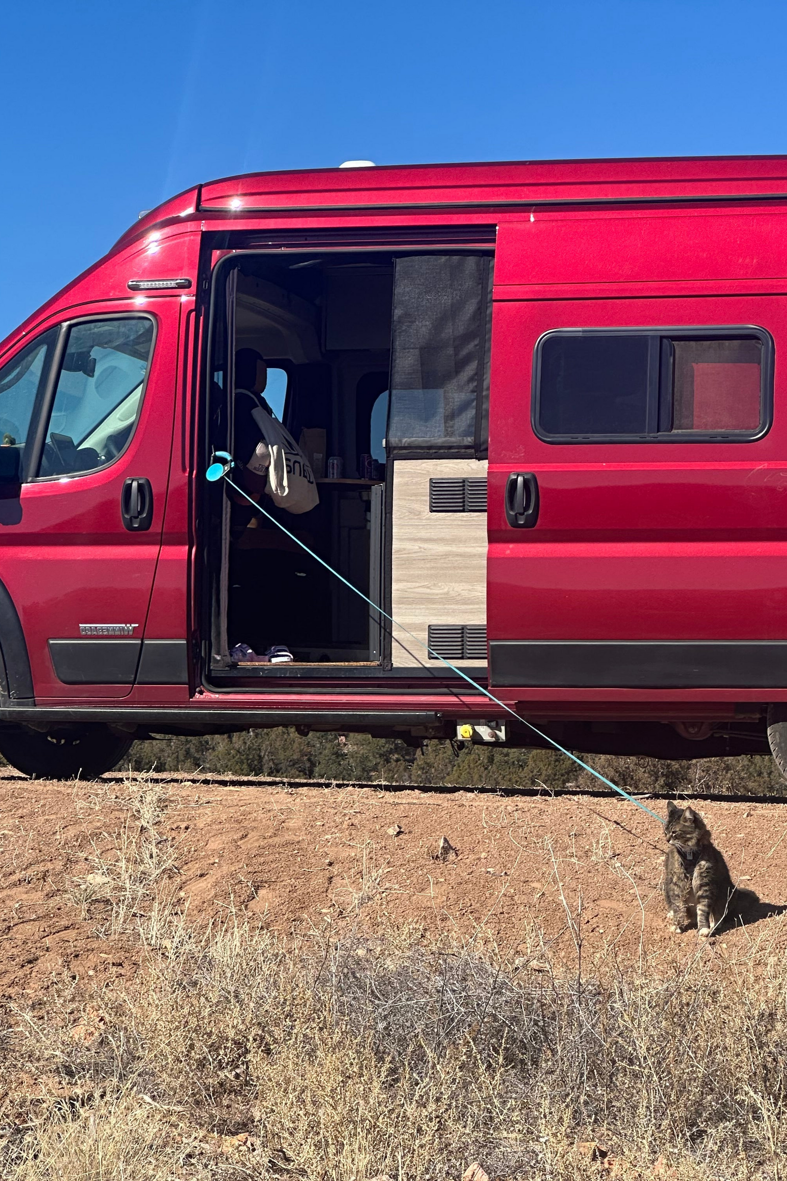 Living in a van also means chaos—like nearly losing our generator in the desert outside Las Vegas. Or the time Todd jumped out of the van at a campground and we didn’t notice until we were miles down the road. We went back and found him meowing under a dumpster. He never did that again.