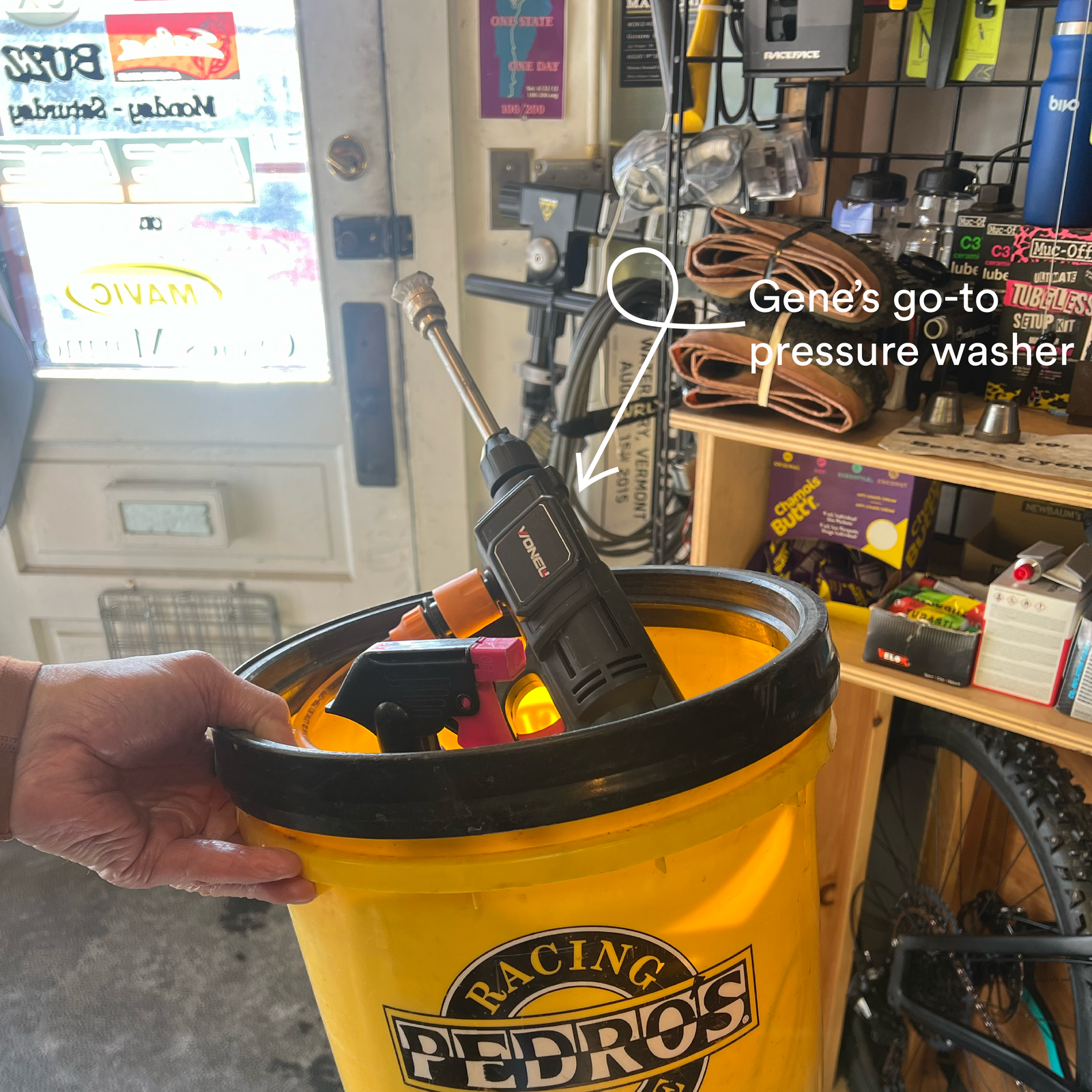 After every ride (right away, "don't get a beer first," Gene emphasized), douse your bike with hot water, either poured from a water bottle, a bucket, from a pressure hose, or from a spray bottle for plants.