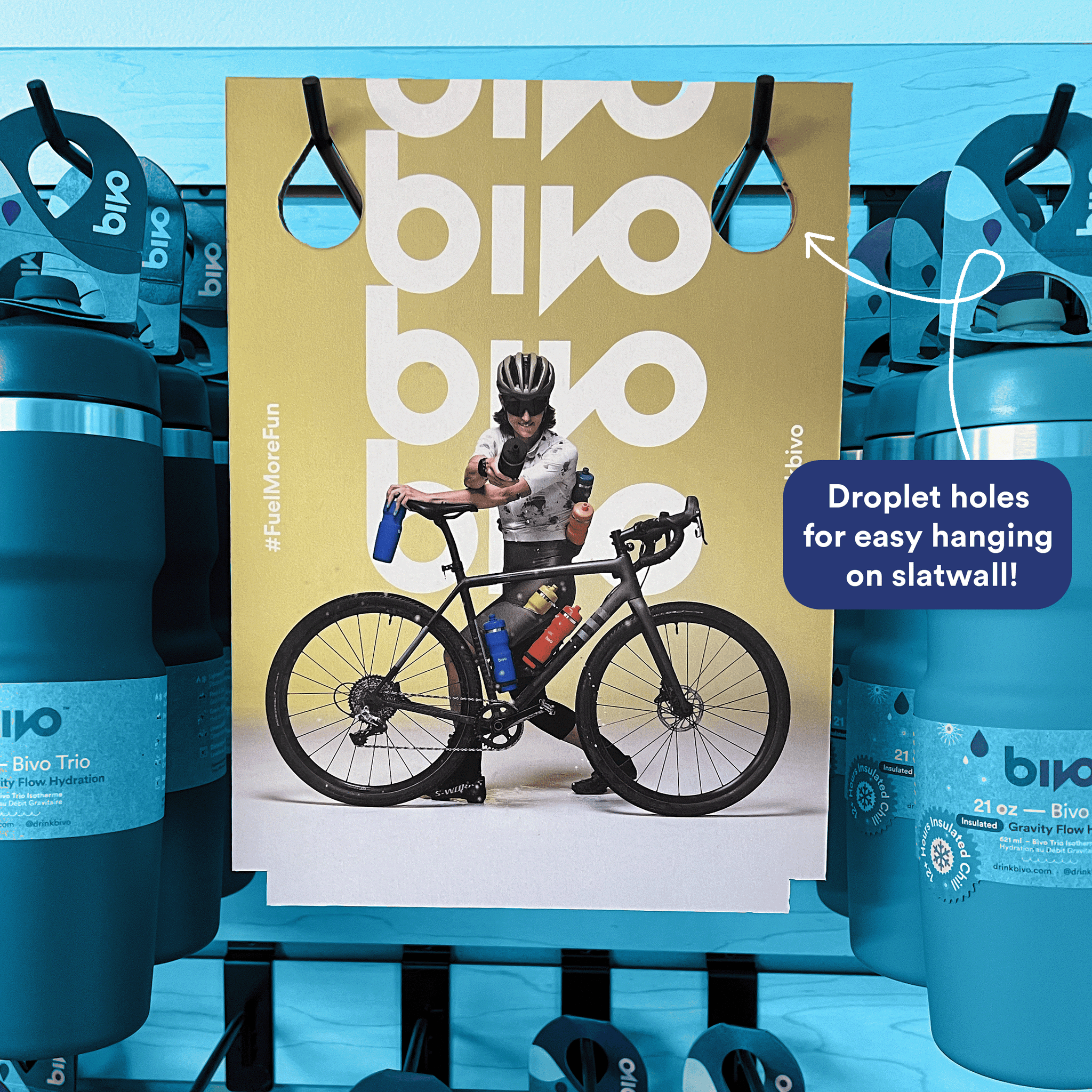 - Doubles as a slatwall sign, with droplet holes for easy hanging